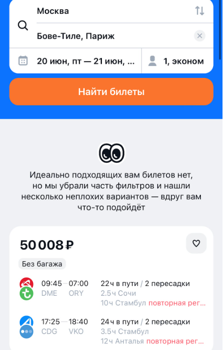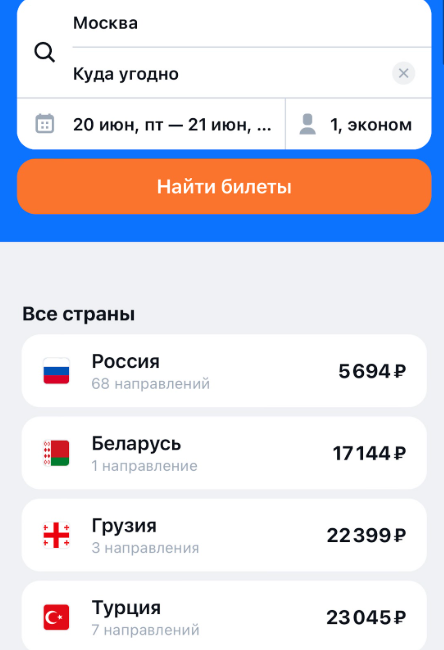 Если важнее цена, а не направление — ищите билеты по опции «куда угодно» или «в любой город». Так вы увидите все самые дешевые направления на ваши даты.